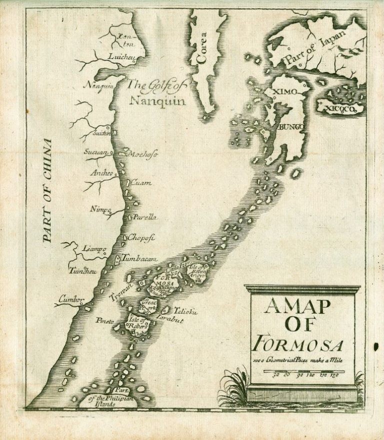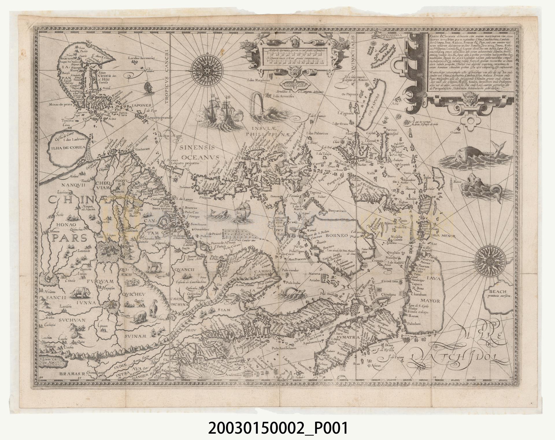 1596年西方荷蘭人所畫的亞洲地圖,裡頭的臺灣是裂成三塊的島嶼形狀,外國人從海面上的角度觀看,用坐船的方式行經臺灣島時所觀測出來的模樣,這也是最早臺灣在古地圖上出現的樣貌,反映了西方世界對臺灣島早期的認識。
