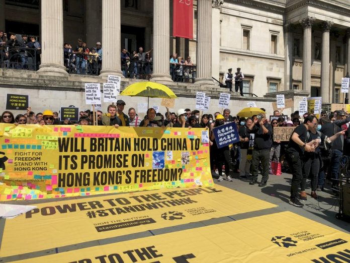 支持「反送中」的抗議人士高舉寫著「英國會讓中國信守對香港自由的承諾嗎?」、「人民力量:與香港站在一起」的標語、以及提到英國新首相強生(Boris Johnson)的「強生會向中國投降嗎」標語。