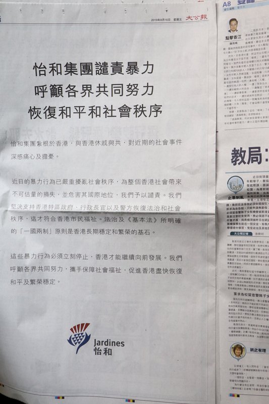 怡和集團在報章刊登全版中文廣告,內文指近日的暴力行為已嚴重擾亂社會秩序,為整個香港社會帶來不可估量的損失,並危害其國際地位,集團方面予以譴責。