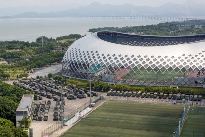 圖為數十輛中國軍用車15日停在深圳灣體育中心外圍。 (路透社/達志影像)