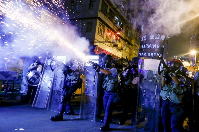 香港14日晚間又有數百人聚集在深水埗警署外頭,警方施放多枚催淚瓦斯驅離。(路透社/達志影像)