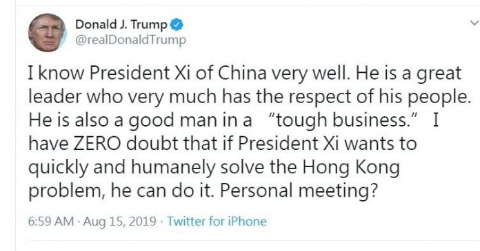 川普的推文也說:「私人會晤?」這被解讀為川普似乎願意就香港情勢向習近平提出建議。