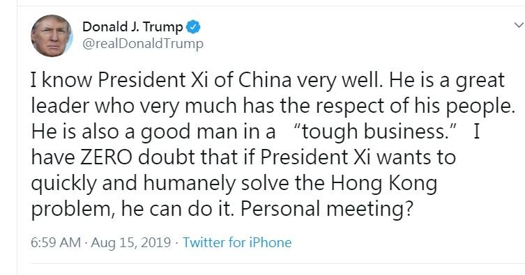 川普在14日的第一則推文中指出,中國藉著貨幣貶值來平衡美國的關稅衝擊。川普並表示,中國當然希望能很快與美國達成貿易協商,但「讓他們先人道處理香港(問題)吧!」(Let them work humanely with Hong Kong first!)。川普的說法似乎似乎將把香港情勢列為美中貿易談判的一項關鍵議題。