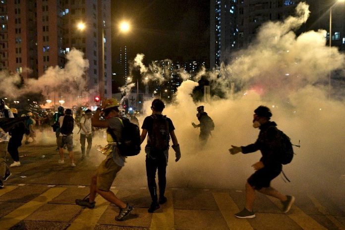 香港警方8月3日在黃大仙地鐵站拘捕示威者,引發居民不滿,最終演變成對峙衝突,港警對身穿便服的居民施放催淚彈與胡椒噴霧,驅散群眾。(AFP)