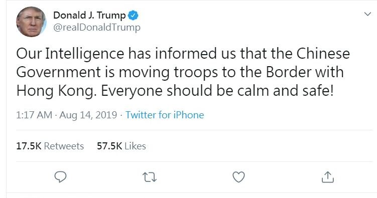 川普在推特發文時引述美國情報說,中國政府正調動部隊到香港邊界,呼籲各方冷靜。「我們的情報告訴我們,中國政府正調動部隊到香港邊界。大家都應冷靜且安全!」
