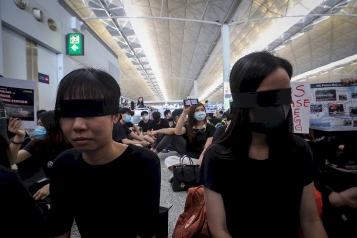 香港「反送中」抗爭11日遭警方空前強勢鎮壓,一名示威女子遭射傷右眼,引發黑衫軍強烈憤慨,12日中午1時號召全民罷工,民眾以黑布遮眼,要求「警察還眼」。(圖:中央社)
