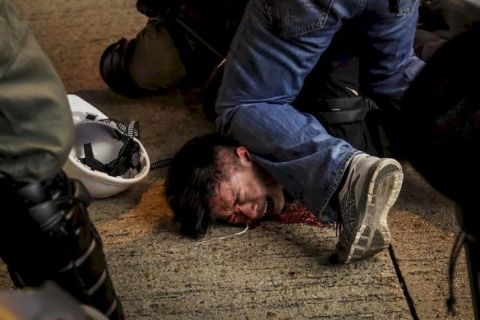 在雙方的情緒被刺激到臨界點下,尖沙咀警方大舉衝向示威者,採取強勢作法徒手將10餘名示威者壓制在地,逕行逮捕。更有一名女性遭布袋彈擊中右眼,血流如注。