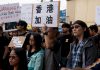 另一方面,港島東的遊行則從維園集會展開。但在同一時間,距維園不遠的北角一處餐廳,卻有200、300名來自中國福建的「紅衣人」集會。使這場遊行一度蒙上山雨欲來風滿樓的氣氛。