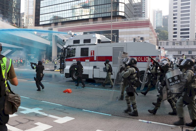 香港民眾15日再次上街遊行反送中,遊行結束後,部分示威者轉而包圍政府總部,警方在傍晚6時前後動用裝有藍色染劑的水炮車強力驅散他們。(圖:中央社)