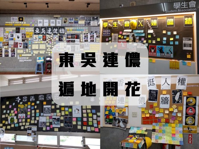 東吳大學港生發起聲援香港「反送中」的連儂牆,日前遭到撕毀破壞。聲援者則以「撕一貼百」回應,目前連儂牆已擴張至原來的2倍大。(圖:東吳大學學生會臉書)