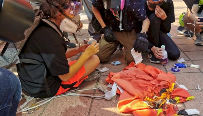 香港反送中遊行隊伍經過屯門大會堂時,有示威者拉下掛在大會堂外的中共五星旗並燒毀。(圖:中央社)
