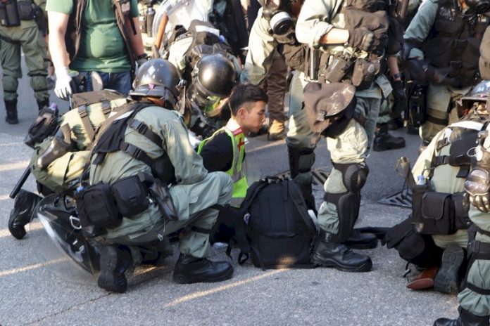 香港反送中人士21日下午在屯門舉行遊行,港警於下午4時過後開始驅離行動,並在示威者投擲汽油彈後,逮捕示威者。(圖:中央社)