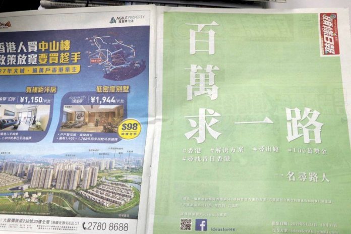 香港報章24日出現一則廣告,內容是尋求解決現時香港困局的方案,獎金是港幣100萬元(新台幣383萬元)。(圖:中央社)
