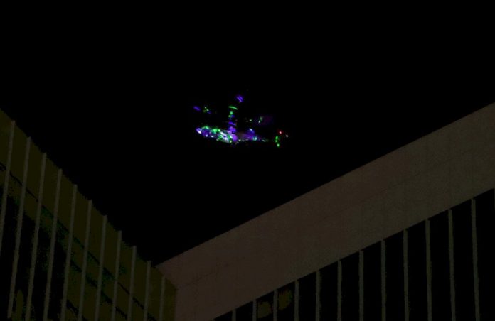 香港占中5週年集會28日晚間在添馬公園登場。公園及政府總部上空有警方直升機定點不動,從高空往下監視人群,示威者不時以雷射筆照向直升機。