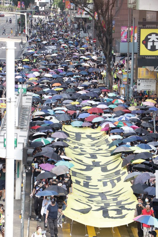 5日是香港實施禁蒙面法的第一天,許多港人仍然戴著口罩遊行抗議。圖為遊行隊伍下午3時許抵達灣仔,龍頭手持「我願榮光歸香港」的布條。