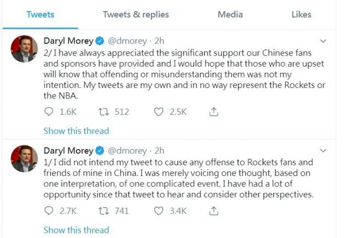 摩瑞表示:「我一直很感謝廣大中國球迷的支持,以及提供的協助。我希望那些對推文不滿的人能了解,冒犯或誤解不是我的本意。」