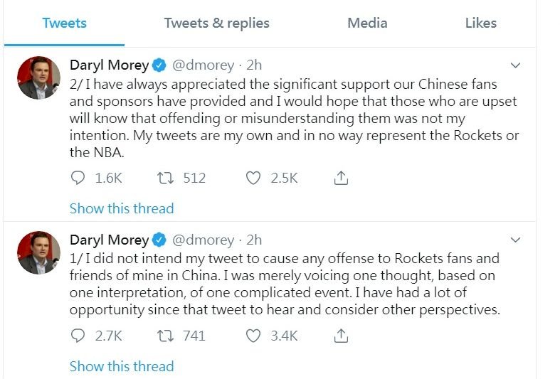 對於引發軒然大波,摩瑞今天在推特上表示:「我的貼文無意冒犯任何火箭隊的球迷,以及我在中國的朋友。」