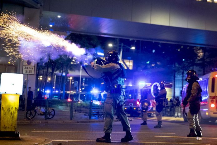香港鎮暴警察7日對示威者發射催淚彈。(路透社/達志影像)