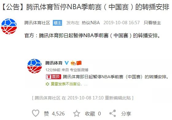 中國騰訊體育8日下午宣布,即日起暫停NBA季前賽(中國賽)的轉播安排。(圖擷自騰訊體育社區)
