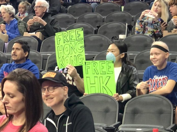 費城76人9日在對戰CBA廣州龍獅熱身賽中,有球迷因高舉挺港標語,並高喊香港自由,遭保全驅逐出場。(圖:Sam Wachs推特)