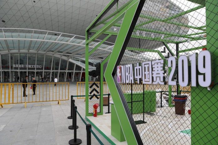 休士頓火箭隊總經理摩瑞發表挺香港的言論,引發中國暫停轉播NBA季前賽(中國賽)。此前,基於國家立場,中國當局曾3度下令停播NBA賽事。圖為10日將登場的中國賽上海場外,因為停播與贊助商撤走,顯得冷清。(中新社提供)