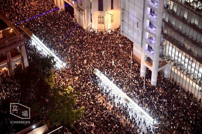 無懼當局打壓,「香港人權法造勢大會」14日晚間於香港中環遮打花園舉行,現場人潮將集會地點擠爆。(圖:立場新聞)