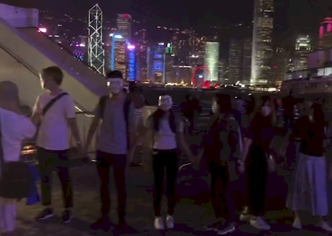 香港網民發起各區面具人鏈活動,參與者戴上不同圖案的面具,包括小熊維尼、川普、V怪客等,又高呼口號表達訴求,有參與人士演奏「願榮光歸香港」及「獅子山下」。
