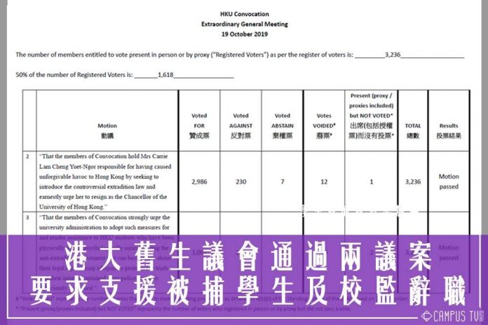 香港大學畢業生議會今天(19日)早上舉行特別會員大會,通過兩項議案,包括要求香港行政長官林鄭月娥辭去校監一職,以及校方管理層應支援因為參與反修例運動而受傷或被捕的港大學生。這兩項議案的贊成票數分別取得2,986和3,002票,佔總投票人數的九成以上。