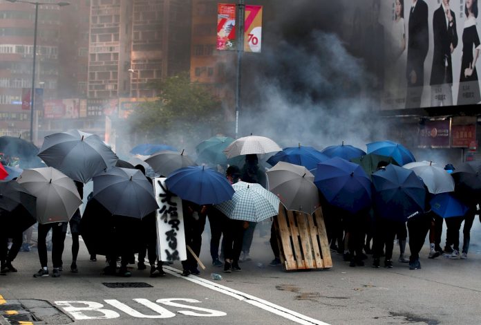 香港示威者20日用雨傘抵擋警方的催淚彈。(路透社/達志影像)