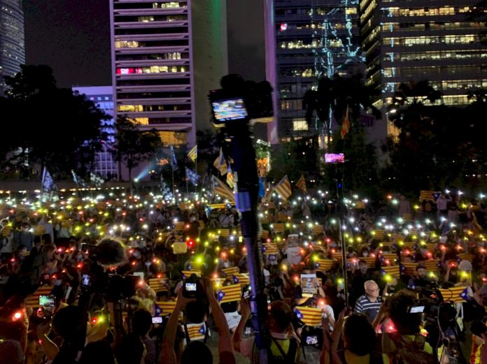 香港民眾反送中示威不但沒見降溫,甚至還支持起加泰隆尼亞人反抗極權集會,這讓中國官方更為加重批評反送中運動。(馮啟恩 攝)