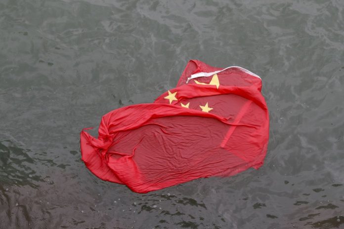 香港反送中抗爭,示威民眾將中國五星旗拋丟入海。(美聯社/達志影像)