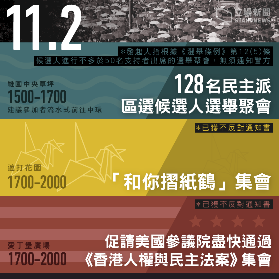 港媒立場新聞報導,128名候選人將會在香港維多利亞公園中央草坪的不同位置,同時進行選舉集會,每場聚會歡迎最多50人出席。