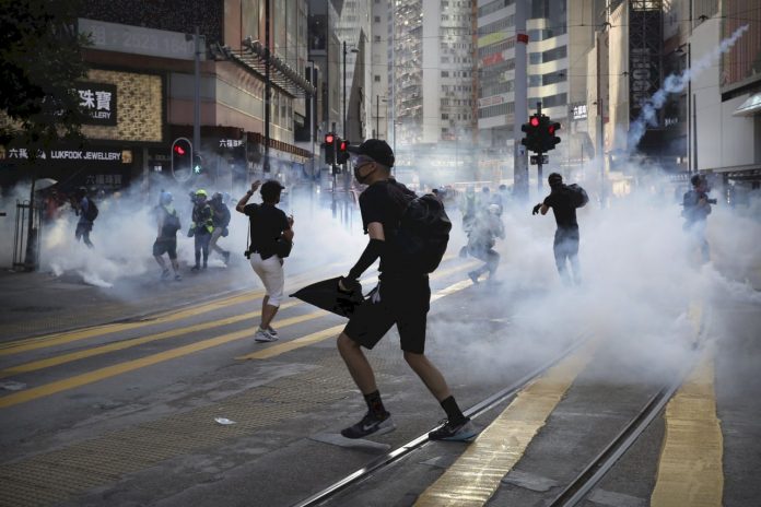 大批香港市民2日下午在銅鑼灣聚集時,警方下午4時左右在銅鑼灣崇光百貨外施放多枚催淚彈驅散示威者。(美聯社/達志影像)