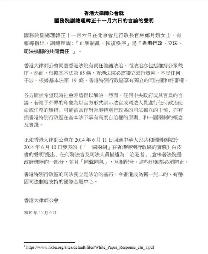 香港大律師公會9日發表聲明,反駁中國國務院副總理韓正先前提出,止暴制亂是香港行政、立法、司法機關的共同責任。(圖:香港大律師公會)