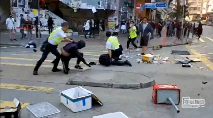 在港島西灣河,有警察制止示威者堵路時更開了三槍,據報有兩人受傷。