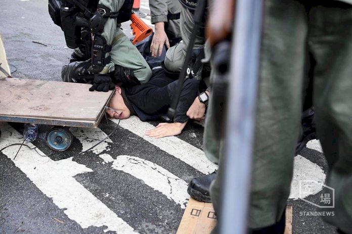 港警衝入中大校園追捕示威學生,遭捕學生遭港警以板車壓頭。圖:立場新聞