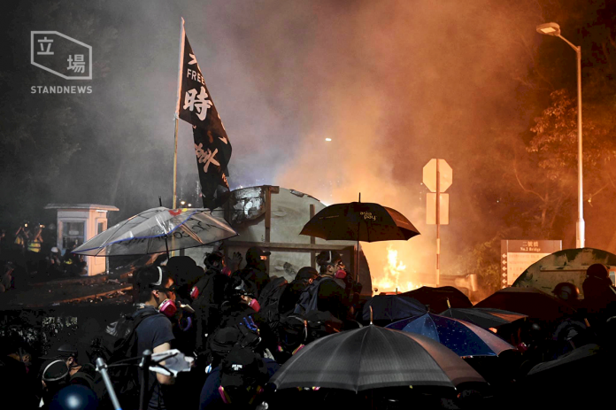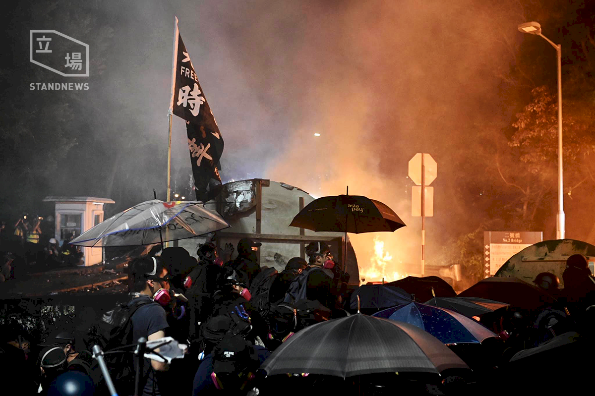 香港中大12日晚上爆發新一輪衝突。防暴警察持續在二號橋向中大校園方向的學生防線,不斷發射催淚彈及橡膠子彈。有示威者投擲汽油彈還擊。(圖:立場新聞提供)