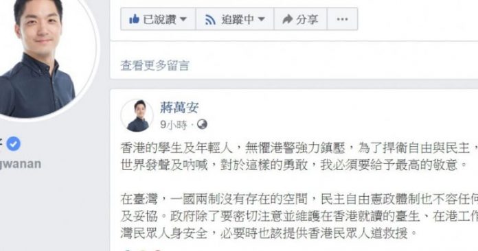 面對香港目前發生的狀況,蔣萬安今天透過臉書表示,香港的學生及年輕人,無懼港警強力鎮壓,為了捍衛自由與民主,向全世界發聲及吶喊,對於這樣的勇敢,他必須要給予最高的敬意。
