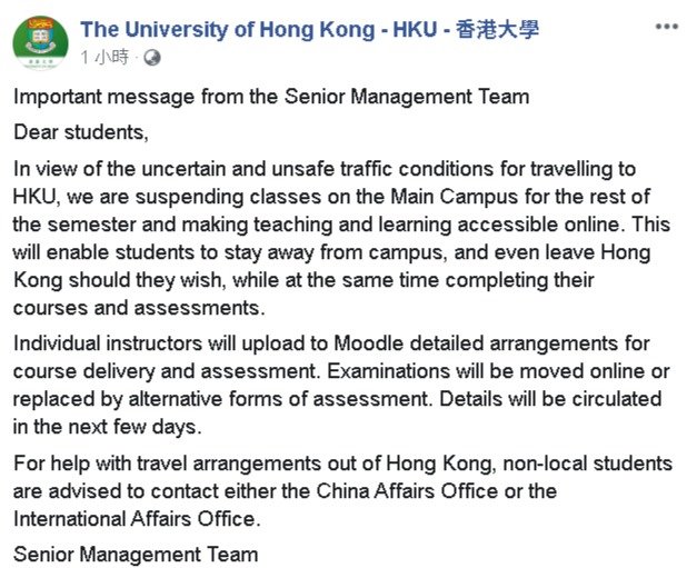 香港大學今天宣布,終止本學期在本部校園的所有課堂。(臉書)