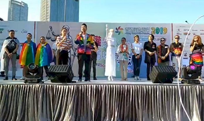 香港同志組織「香港彩虹」今天(16日)在愛丁堡廣場舉行集會,宣傳性小眾平等,有多國領事館代表、平機會主席朱敏健,以及立法會議員陳志全出席。