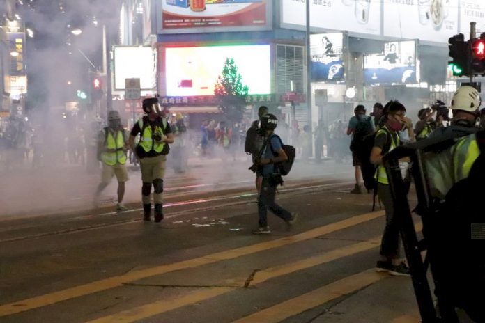 近百名香港反送中示威者晚間持續在銅鑼灣SOGO百貨一帶聚集不願離去,防暴警察發射數枚催淚彈進行驅散。(中央社)