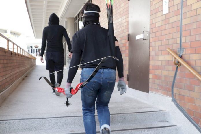 香港理工大學抗爭學生,持弓箭對付防暴警察。