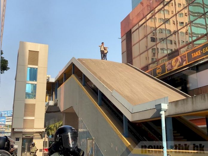 一男一女從連接香港理工大學及尖東的天橋步出,他們舉起雙手、除下身上裝備,示意投降。(圖: 香港電台)
