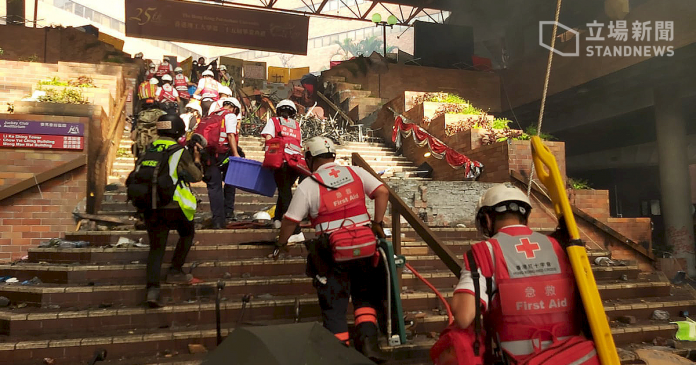 香港理工大學示威學生18日三度試圖突圍失敗導致多人受傷,現場醫護嚴重不足,直到下午終於有紅十字會人員進入救援。(圖:立場新聞)