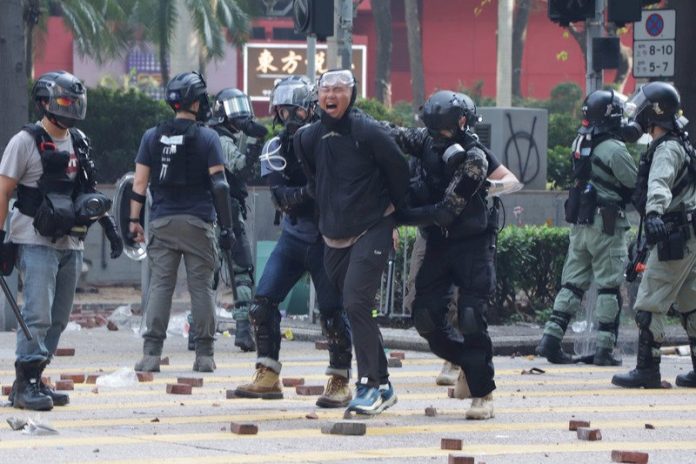 香港情勢升高!蘇嘉全:暴力鎮壓只會造成撕裂。圖為香港理工大學18日成為反送中主戰場,警方封鎖周圍500公尺,漆咸道和金馬倫道周圍爆發衝突。外圍有示威者想進入理大支援,防暴警察多次放催淚彈阻止。(資料照片/CNA)