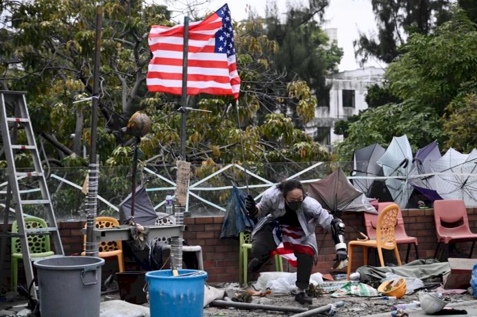 美國參議院通過香港法,理大留守學生在校園內揮動美國國旗。圖:立場新聞