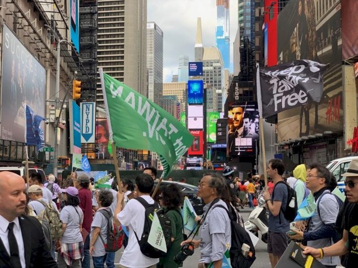 第74屆聯合國大會17日在紐約總部開議前,大紐約與周邊地區台灣社群發起年度入聯遊行。參與者中午齊聚鄰近紐約大學的阿斯托廣場(Astor Place),集會一小時後展開遊行,走向曼哈頓中城西側的中國駐紐約總領事館,全程約4.8公里。