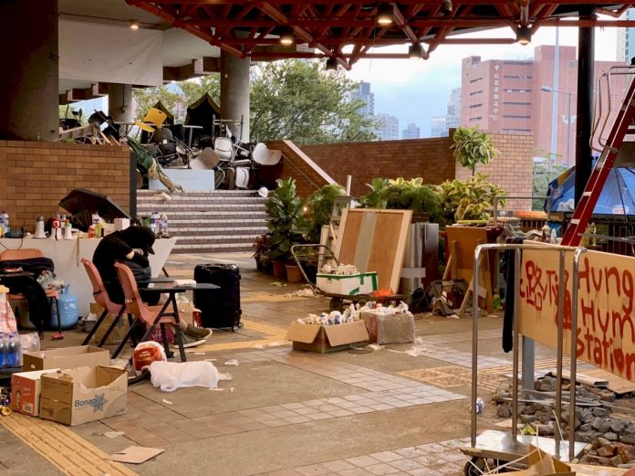 數十名支持民主的抗議人士今天(20日)仍續留在被港警包圍的香港理工大學校園內。這些抗議人士已是連續第四天待在香港理大,抗議行動也陷入困境;於此之際,支持者透過電話佔線干擾了香港的火車網路,以分散警察的注意力。