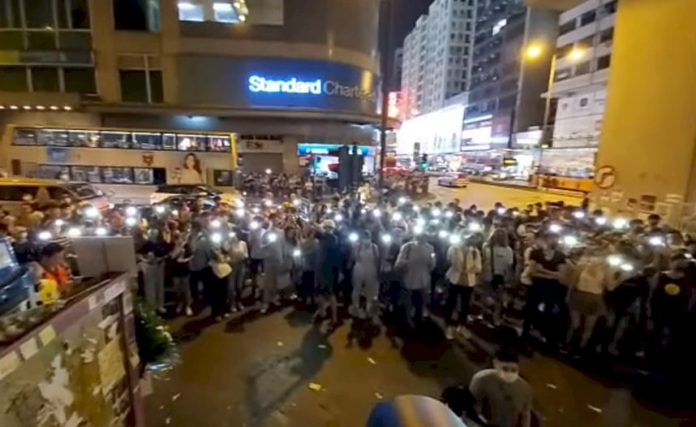 香港反送中示威者7日晚間再次聚集旺角警署周邊,抗議港鐵太子站的車廂無差別襲擊市民事件。(圖擷自YouTube)