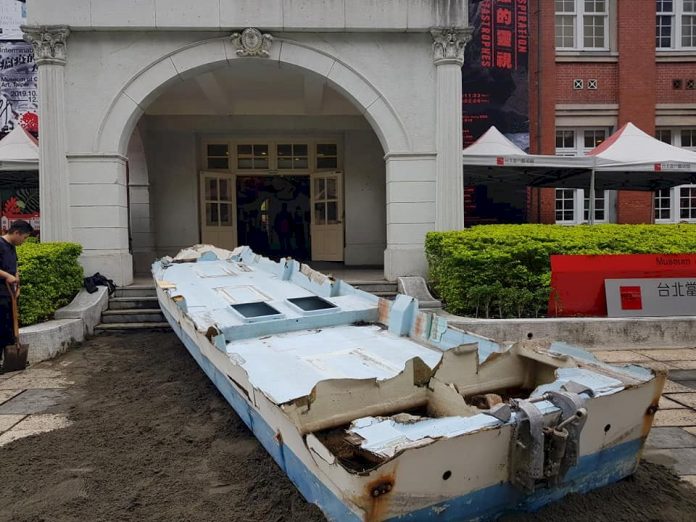 一艘在日本311大地震漂流擱淺於台東的舢舨漁船擺放在台灣當代藝術館門口,為場館策劃的跨年大展「災難的靈視」拉開序幕。
